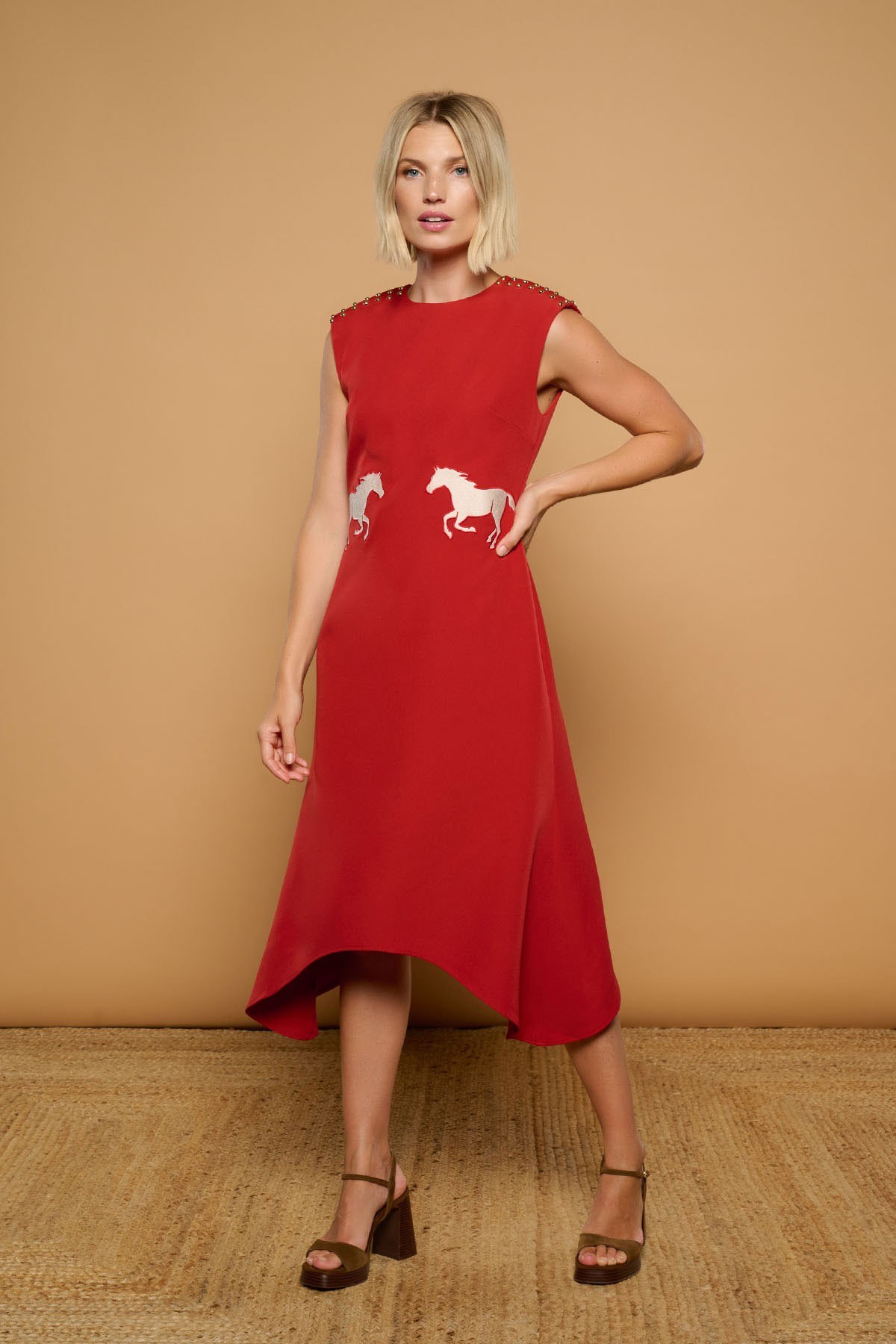 Vestido midi de cuello redondo y manga sisa con bajo asimétrico y silueta evasé. Detalle de tachuelas en hombreras. silueta de caballos bordados en cintura. Cierre con cremallera trasera.