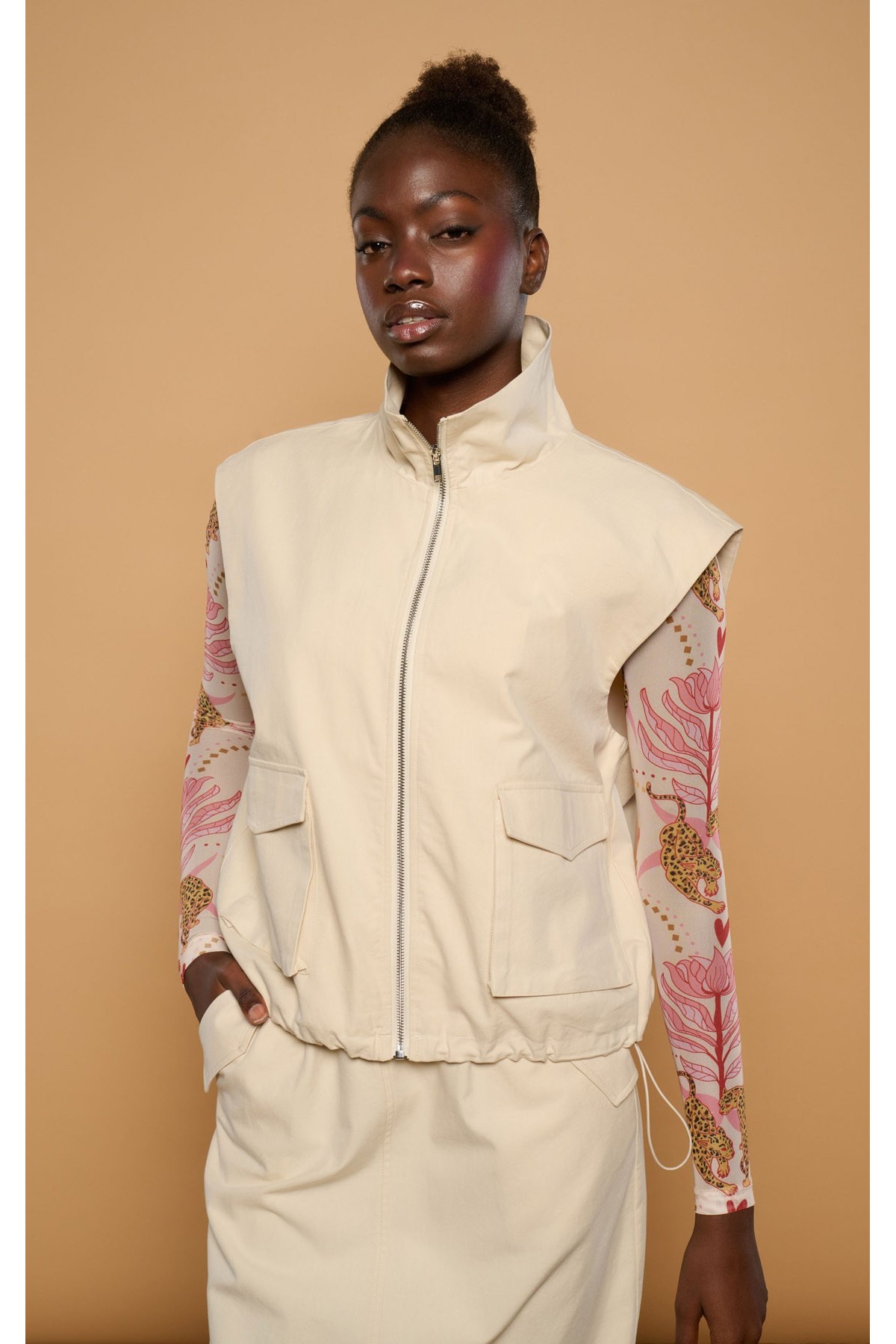 Chaleco de cuello alto. Cierre con cremallera frontal. Estilo safari. Bolsillos laterales de plastón. Detalle de tigres boho bordados en espalda. Tejido de algodón y viscosa.