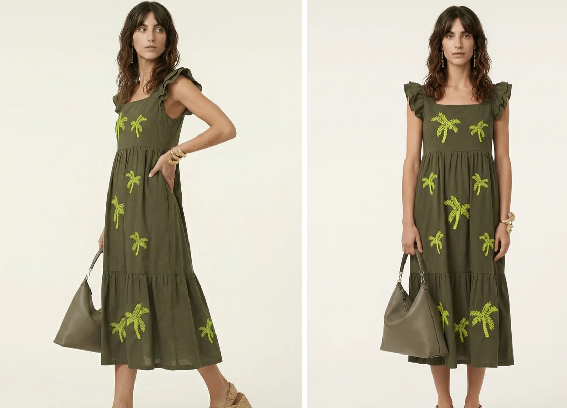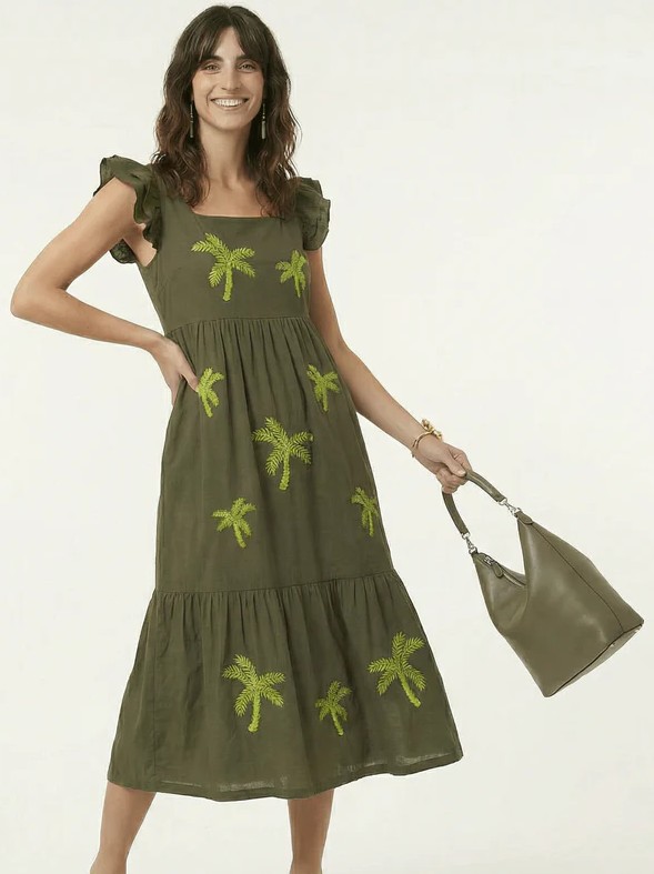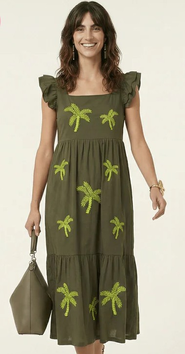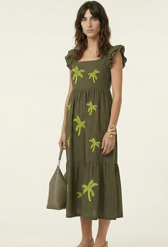 Este vestido verde militar es fusión inesperada pero exitosa: verde militar/oliva (color utilitario históricamente asociado con uniformes desde WWI) + palmeras bordadas verde ácido (motivo tropical vacation) + volantes románticos = prenda que equilibra masculino-femenino, funcional-decorativo, serio-playful. El escote cuadrado y estructura tiered (tres niveles separados: busto, medio, bajo) crean silueta favorecedora que define sin ceñir. Como hemos documentado, verde militar es neutro sofisticado que combina sorprendentemente bien con prácticamente todo porque es natural, terroso, versátil.