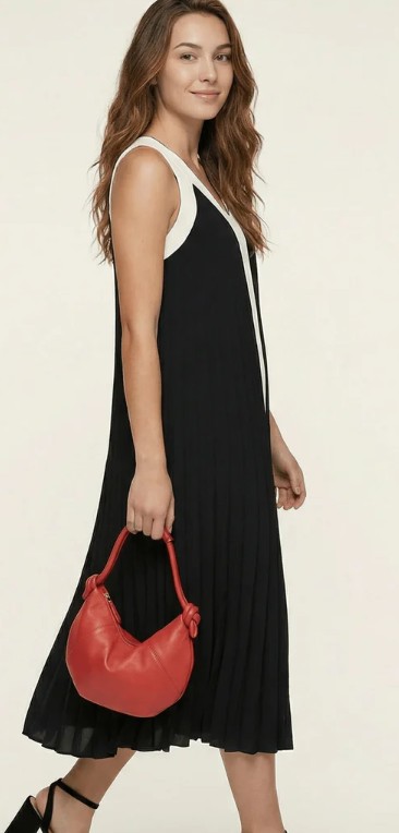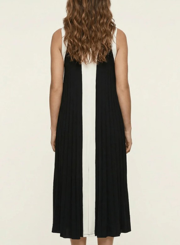 Este vestido negro es extensión elegante en largo maxi de la camiseta colour blocking documentada previamente, compartiendo exactamente misma arquitectura de panel blanco central vertical más ribetes blancos en sisas pero ejecutada en longitud maxi hasta tobillos con adición dramática de plisado en paneles negros que crea textura tridimensional mediante pliegues verticales permanentes. Donde "Camiseta Negra Tirantes con Corte en Contraste Lolitas&L" ofrece colour blocking en formato top casual, este vestido proporciona misma estética minimalista gráfica en pieza completa apropiada para ocasiones donde vestido es esperado o preferido, multiplicando versatilidad de paleta negro-blanco mediante formato diferente en ADN compartido.