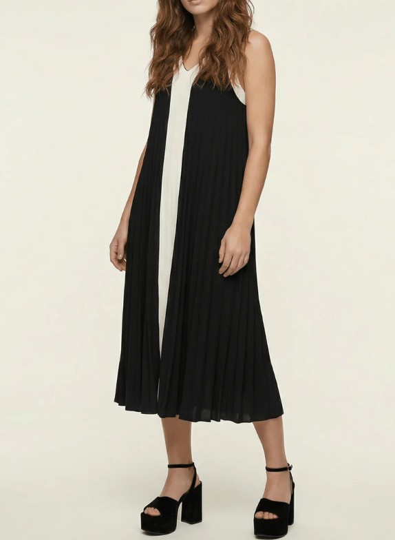 Vestido maxi negro con panel blanco central vertical - Escote en V y tirantes anchos - Viscosa fluida plisada - Estilo colour blocking minimalista elegante - Fabricado en Portugal