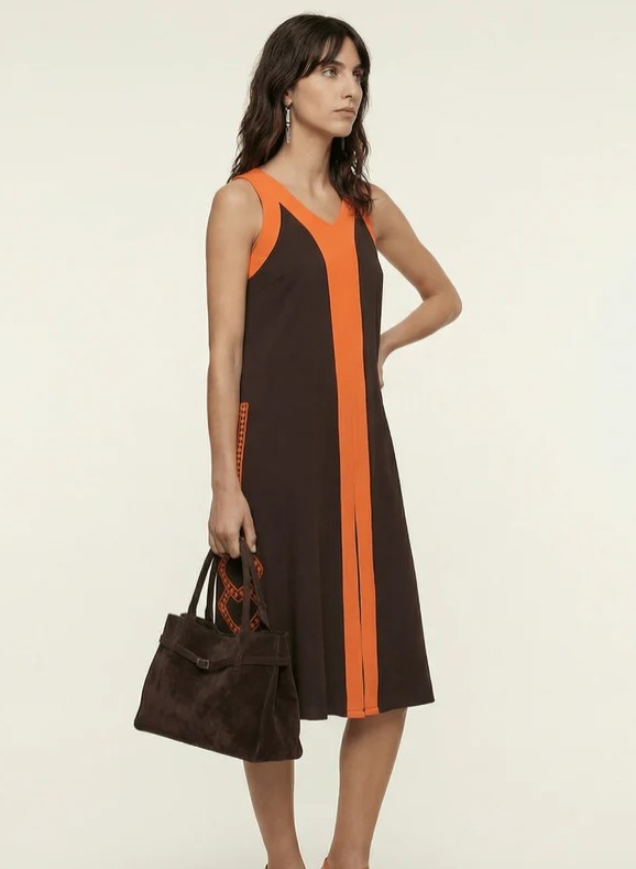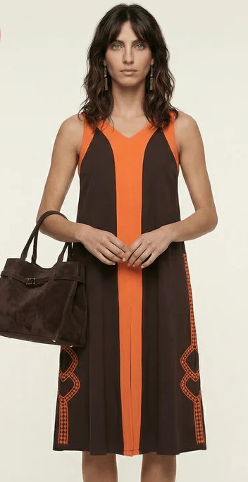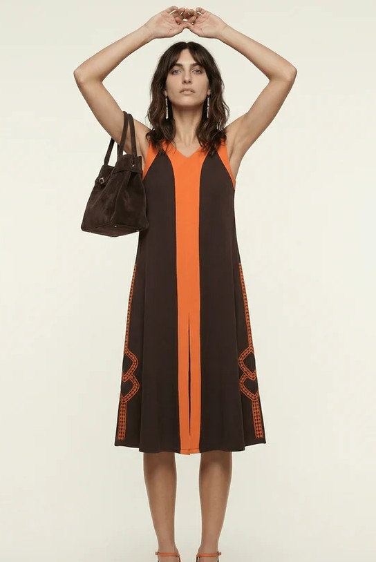 Vestido midi marrón chocolate con panel naranja central y cenefas bordadas laterales - Escote en V y sin mangas - Algodón elástico - Estilo colour blocking étnico-contemporáneo - Fabricado en Portugal