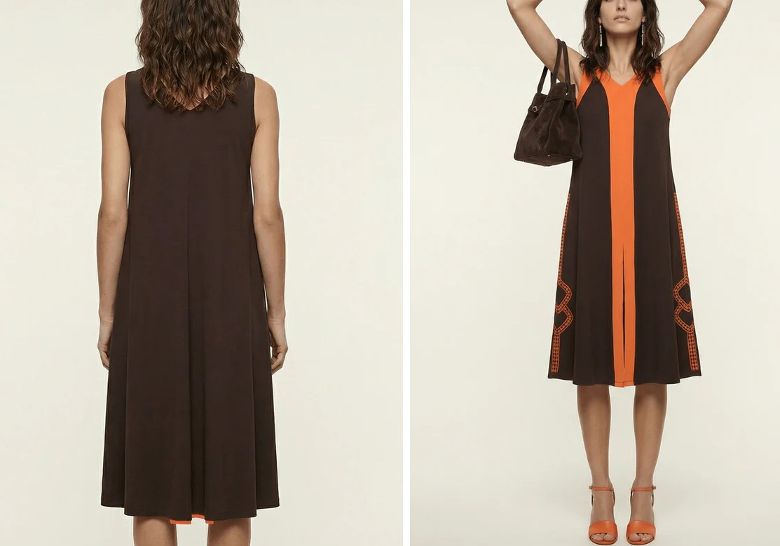 Este vestido marrón chocolate es fusión magistral de dos técnicas documentadas previamente: colour blocking minimalista mediante panel naranja central vertical más cenefas bordadas geométricas laterales. Donde "Vestido Negro Tirantes con Corte Contraste en el Centro Lolitas&L" ejecuta colour blocking puro con plisado, y "Camiseta Naranja con Cenefa Bordada en Contraste Marrón Lolitas&L" más "Pantalón Marrón Goma con Cenefa Naranja Bordada Lolitas&L" exploran cenefas exclusivamente, este vestido híbrido combina ambas estrategias creando pieza que es simultáneamente gráfica mediante panel sólido Y artesanal mediante cenefas bordadas que serpentean verticalmente por costados añadiendo complejidad técnica a simplicidad visual del colour blocking.